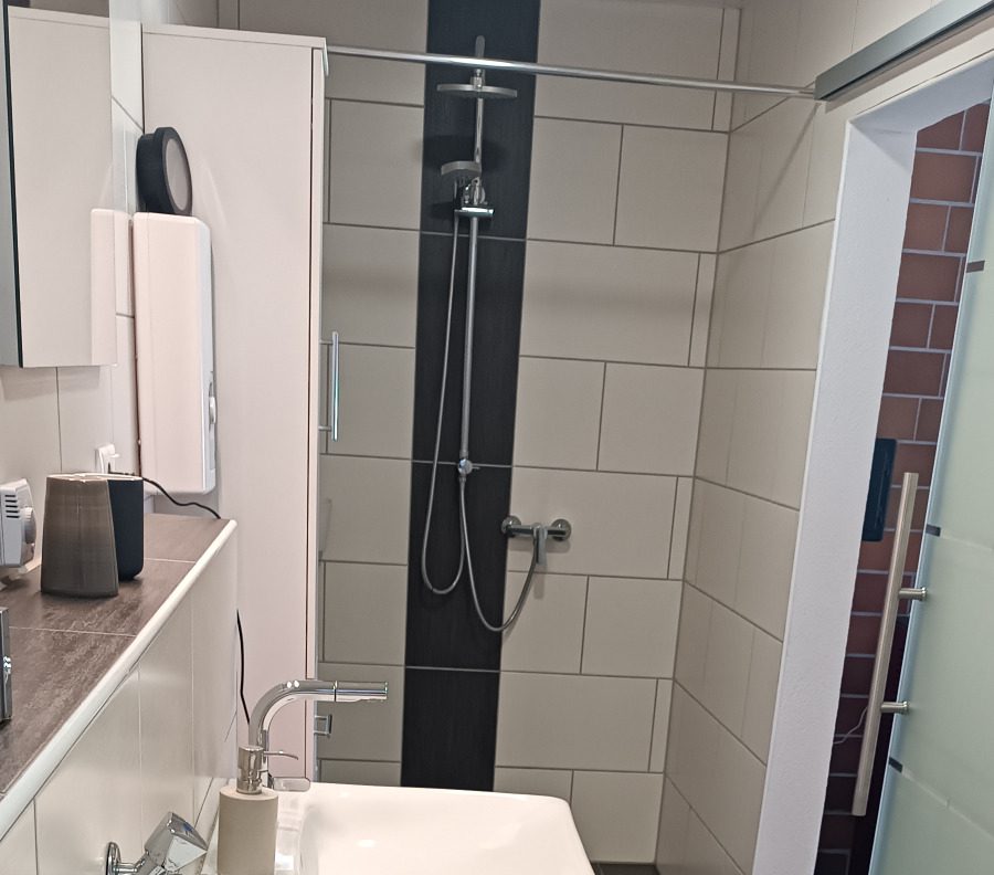 Ebenso ein modernes Bad mit ebenerdiger Regendusche.